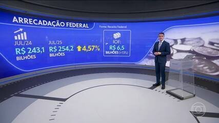 O resultado representa uma queda real de 1,5% na comparação com o mesmo mês do ano passado, quando a arrecadação somou R$ 212 bilhões (valor corrigido pela inflação). De acordo com a Receita Federal, a redução da arrecadação em agosto deste ano está relacionada com as enchentes no Rio Grande do Sul (leia mais abaixo). Arrecadação federal bate recorde em julho Sem esse efeito extraordinário, no valor de R$ 3,6 bilhões, o Fisco diz que a arrecadação haveria aumento real na arrecadação do mês de agosto. A explicação é que, nos primeiros meses após as enchentes, os negócios da região puderam atrasar o pagamento dos tributos, que foram recolhidos posteriormente — o que inflou a arrecadação em R$ 3,6 bilhões em agosto de 2024. “A contribuição Previdenciária com vencimento em maio de 2024 foi postergada para agosto de 2024′”, lembrou a Receita Federal. De acordo com o chefe do Centro de Estudos Tributários e Aduaneiros da Receita Federal, Claudemir Malaquias, a desaceleração da atividade econômica, fruto do elevado nível da taxa de juros, também influenciou negativamente a arrecadação em agosto. “A desaceleração da atividade econômica impacta diretamente na arrecadação. Produção industrial, consumo, vendas no varejo que apresentaram redução em relação ao mesmo mês do ano passado e explicam o motivo da arrecadação também vir abaixo. A explicação principal é a desaceleração da atividade econômica”, disse Claudemir Malaquias, da Receita Federal. Aumento do IOF ▶️De acordo com a Receita Federal, a queda na arrecadação foi registrada mesmo com ajuda do aumento do Imposto Sobre Operações Financeiras (IOF), anunciado pelo governo em meados de maio. Segundo dados da Receita Federal, a arrecadação do IOF ficou, em agosto, R$ 2,21 bilhões maior do que no mesmo período do ano passado (em valores corrigidos pela inflação), principalmente por conta do aumento do tributo. Parcial do ano Nos oito primeiros meses deste ano, ainda segundo dados oficiais, a arrecadação federal somou R$ 1,89 trilhão — sem a correção pela inflação. Em valores corrigidos pela variação dos preços, a arrecadação totalizou R$ 1,91 trilhão de janeiro a agosto, o que representa um crescimento real (acima da inflação) de 3,73% em relação ao mesmo período do ano passado, quando somou R$ 1,84 trilhão. Nos oito primeiros meses deste ano, a arrecadação bateu recorde histórico para o período. ▶️Além da alta do IOF, o governo também contou com o aumento de outros tributos, efetuados nos últimos anos, para melhorar a arrecadação em 2025. São eles: Tributação de fundos exclusivos, os “offshores”;Mudanças na tributação de incentivos (subvenções) concedidos por estados;Retomada da tributação de combustíveis;Tributação das bets;Imposto sobre encomendas internacionais (taxa das blusinhas);Reoneração gradual da folha de pagamentos;Fim de benefícios para o setor de eventos (Perse). Meta fiscal de 2025 A alta da arrecadação está na mira do governo para tentar zerar o rombo das contas públicas neste ano, meta que consta na Lei de Diretrizes Orçamentárias (LDO) de 2024. Porém, há um intervalo de tolerância de 0,25 ponto percentual previsto no arcabouço fiscal (a nova regra das contas públicas). O governo pode ter um déficit de até 0,25% do Produto Interno Bruto (PIB) sem que o objetivo seja formalmente descumprido, o equivalente a cerca de R$ 31 bilhões.Para fins de cumprimento da meta fiscal, também são excluídos outros R$ 44,1 bilhões em precatórios, ou seja, decisões judiciais. Proposta para 2026 ▶Aumento da alíquota sobre bets, de 12% para 18% sobre a receita líquida (GGR): medida vai arrecadar mais sobre o lucro das bets. ▶Juros sobre capital próprio: aumento da taxação dos juros sobre capital próprio (JCP) — mecanismo utilizado pelas empresas — de 15% para 20%. O JCP é uma forma de distribuição de lucros alternativa aos dividendos (que são isentos de imposto). ▶Aumento de zero para 5% na taxação dos chamados títulos incentivados, como LCI, LCA: medida vai arrecadar mais dinheiro sobre esses investimentos. ▶Tributação de criptoativos: governo atualizou e esclareceu as regras de tributação para os rendimentos, inclusive os ganhos líquidos, de operações com ativos virtuais (criptoativos). ▶Taxação de “fintechs” (empresas de tecnologia em serviços financeiros): empresas de tecnologia do sistema financeiro pagavam 9% de CSLL, e passarão ser tributadas como as demais instituições financeiras, com alíquotas de 15% ou 20%.