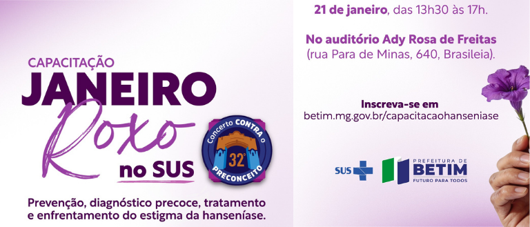 Integrando a programação do 32º Concerto Contra o Preconceito, a Prefeitura de Betim, por meio das secretarias municipais de Cultura e de Saúde, promove, nesta quarta-feira (21), a Capacitação: Janeiro Roxo no SUS – Prevenção, Diagnóstico Precoce, Tratamento e Enfrentamento do Estigma da Hanseníase. A atividade ocorre das 13h30 às 17h, no auditório do Centro Administrativo da Prefeitura de Betim. As inscrições devem ser feitas no link betim.mg.gov.br/capacitacaohanseniase.