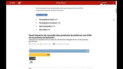 O ex-presidente Jair Bolsonaro (22%) e o deputado Eduardo Bolsonaro (17%) são, respectivamente, o segundo e o terceiro mais citados como principais responsáveis. Segundo o Datafolha, 15% apontam o ministro Alexandre de Moraes, do STF, como responsável pelo tarifaço. A pergunta feita pelo instituto aos entrevistados foi: “Na sua opinião, das figuras brasileiras quem é o principal culpado pela taxa de até 50% imposta pelo governo dos EUA?”. Lula: 35%;Jair Bolsonaro: 22%;Eduardo Bolsonaro: 17%;Alexandre de Moraes: 15%;Não sabem responder: 7%;Nenhuma das figuras listadas: 3%;Todos —Lula, Bolsonaro, Eduardo e Moraes— são culpados: 1%. O Datafolha realizou 2.002 entrevistas em 113 municípios entre os dias 11 e 12 de agosto. A margem de erro é de 2 pontos percentuais, para mais ou para menos, num nível de confiança de 95%. Datafolha: 89% dos brasileiros acreditam que tarifaço de Trump vai prejudicar a economia Peso do voto A pesquisa também revelou que a percepção sobre o culpado pelo tarifaço varia conforme o voto dos entrevistados na eleição de 2022. Entre os eleitores de Lula, apenas 11% consideram o petista o principal responsável pelo tarifaço. Nesse grupo, 38% culpam Bolsonaro e 35%, Eduardo. Entre os eleitores de Jair Bolsonaro, 58% apontam Lula como culpado pela sobretaxa e 25%, Moraes. Prisão de Bolsonaro O Datafolha mostra ainda que 40% dos entrevistados acreditam que, após a decretação da prisão domiciliar de Bolsonaro, Trump tomará medidas que prejudicarão ainda mais a economia brasileira. Por outro lado, 28% apostam que o republicano não se preocupará com a prisão de Bolsonaro e aceitará negociar medidas que causem menos impacto econômico. Cerca de 20% dos consultados acreditam que as medidas permanecerão inalteradas, sem ampliar ou reduzir seus efeitos. Por fim, 12% não souberam opinar.
