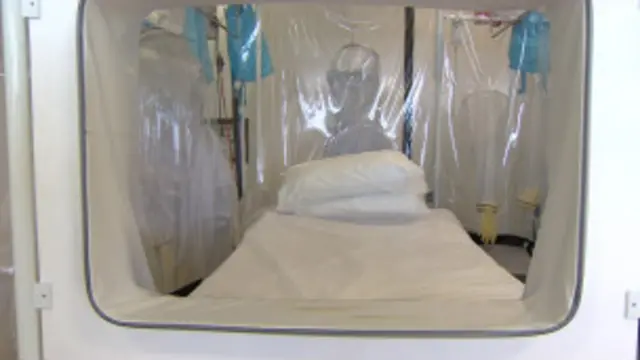 11 agosto 2014Um hospital em Londres tem preparada uma área onde pacientes que forem diagnosticados com ebola receberão tratamento.Legenda da foto, Câmara mantém pacientes totalmente isoladosO atual surto da doença já matou quase mil pessoas na África Ocidental. Mas até agora, nenhum caso foi registrado fora do continente africano.A câmara está instalada no Royal Free Hospital e é a única deste tipo na Grã-Bretanha. Ela mantém o paciente totalmente isolado.Médicos têm que usar roupas especiais em qualquer contato com pacientes, inclusive para administrar medicamentos.Não há tratamento ou vacina contra o ebola, que é um vírus altamente contagioso.Histórias relacionadas