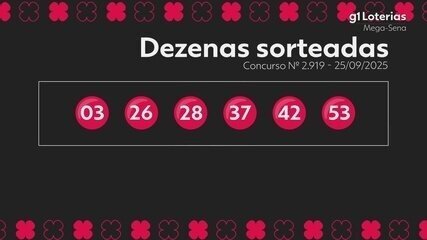 O sorteio do concurso 2.919 da Mega-Sena foi realizado na noite desta quinta-feira (25), em São Paulo. Nenhuma aposta acertou as seis dezenas, e o prêmio para o próximo sorteio acumulou em R$ 80 milhões. Veja os números sorteados: 03 – 26 – 28 – 37 – 42 – 53 5 acertos – 66 apostas ganhadoras: R$ 34.524,564 acertos – 4.131 apostas ganhadoras: R$ 909,21 O próximo sorteio da Mega será no sábado (27). Mega-Sena, concurso 2.919 — Foto: Reprodução/Caixa Entenda como funciona a Mega-Sena e qual a probabilidade de ganhar o prêmio Para apostar na Mega-Sena As apostas podem ser realizadas até as 19h (horário de Brasília) em qualquer lotérica do país ou por meio do site e aplicativo Loterias Caixa, disponíveis em smartphones, computadores e outros dispositivos. O pagamento da aposta online pode ser realizado via PIX, cartão de crédito ou pelo internet banking, para correntistas da Caixa. É preciso ter 18 anos ou mais para participar. Probabilidades A probabilidade de vencer em cada concurso varia de acordo com o número de dezenas jogadas e do tipo de aposta realizada. Para um jogo simples, com apenas seis dezenas, que custa R$ 6, a probabilidade de ganhar o prêmio milionário é de 1 em 50.063.860, segundo a Caixa. Já para uma aposta com 20 dezenas (limite máximo), com o preço de R$ 232.560,00, a probabilidade de acertar o prêmio é de 1 em 1.292, ainda de acordo com a instituição. Bilhetes da Mega-Sena, em imagem de arquivo — Foto: Marcelo Brandt/G1