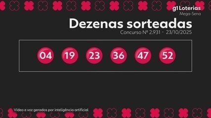 O sorteio do concurso 2.931 da Mega-Sena foi realizado na noite desta quinta-feira (23), em São Paulo. Nenhuma aposta acertou as seis dezenas, e o prêmio para o próximo sorteio acumulou em R$ 95 milhões. Veja os números sorteados: 04 – 19 – 23 – 36 – 47 – 52 5 acertos – 138 apostas ganhadoras: R$ 22.307,654 acertos – 6.897 apostas ganhadoras: R$ 735,73 O próximo sorteio da Mega será no sábado (25). Entenda como funciona a Mega-Sena e qual a probabilidade de ganhar o prêmio Mega-Sena, concurso 2.931 — Foto: Reprodução/Caixa Para apostar na Mega-Sena As apostas podem ser realizadas até as 19h (horário de Brasília) em qualquer lotérica do país ou por meio do site e aplicativo Loterias Caixa, disponíveis em smartphones, computadores e outros dispositivos. O pagamento da aposta online pode ser realizado via PIX, cartão de crédito ou pelo internet banking, para correntistas da Caixa. É preciso ter 18 anos ou mais para participar. Probabilidades A probabilidade de vencer em cada concurso varia de acordo com o número de dezenas jogadas e do tipo de aposta realizada. Para um jogo simples, com apenas seis dezenas, que custa R$ 6, a probabilidade de ganhar o prêmio milionário é de 1 em 50.063.860, segundo a Caixa. Já para uma aposta com 20 dezenas (limite máximo), com o preço de R$ 232.560,00, a probabilidade de acertar o prêmio é de 1 em 1.292, ainda de acordo com a instituição. Bilhetes da Mega-Sena, em imagem de arquivo — Foto: Marcelo Brandt/G1