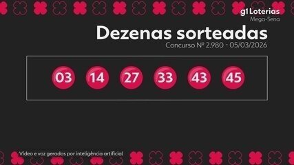 O sorteio do concurso 2.980 da Mega-Sena foi realizado na noite desta quinta-feira (5), em São Paulo. Nenhuma aposta acertou as seis dezenas, e o prêmio para o próximo sorteio acumulou em R$ 50 milhões. Veja os números sorteados: 03 – 14 – 27 – 33 – 43 – 45. 5 acertos: 77 apostas ganhadoras, R$ 24.100,614 acertos: 5.245 apostas ganhadoras, R$ 583,20 O próximo sorteio da Mega será no sábado (7). Mega-Sena, concurso 2.980 — Foto: Caixa Para apostar na Mega-Sena Como funciona a Mega-sena As apostas podem ser realizadas até as 20h (horário de Brasília) em qualquer lotérica do país ou por meio do site e aplicativo Loterias Caixa, disponíveis em smartphones, computadores e outros dispositivos. Já os bolões digitais poderão ser comprados até as 20h30, exclusivamente pelo portal Loterias Online e pelo aplicativo. O pagamento da aposta online pode ser realizado via PIX, cartão de crédito ou pelo internet banking, para correntistas da Caixa. É preciso ter 18 anos ou mais para participar. Probabilidades A probabilidade de vencer em cada concurso varia de acordo com o número de dezenas jogadas e do tipo de aposta realizada. Para um jogo simples, com apenas seis dezenas, que custa R$ 6, a probabilidade de ganhar o prêmio milionário é de 1 em 50.063.860, segundo a Caixa. Já para uma aposta com 20 dezenas (limite máximo), com o preço de R$ 232.560,00, a probabilidade de acertar o prêmio é de 1 em 1.292, ainda de acordo com a instituição. Mega-Sena bilhete volante Loterias — Foto: Millena Sartori/g1