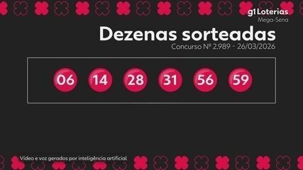 O sorteio do concurso 2.989 da Mega-Sena foi realizado na noite desta quinta-feira (26), em São Paulo. Nenhuma aposta acertou as seis dezenas, e o prêmio para o próximo sorteio acumulou em R$ 40 milhões. Veja os números sorteados: 06 – 14 – 28 – 31 – 56 – 59 5 acertos – 44 apostas ganhadoras: R$ 33.183,444 acertos – 2.443 apostas ganhadoras: R$ 985,14 O próximo sorteio da Mega será no sábado (28). Mega-Sena, concurso 2.989 — Foto: Reprodução/Caixa Como funciona a Mega-sena Para apostar na Mega-Sena As apostas podem ser realizadas até as 20h (horário de Brasília) em qualquer lotérica do país ou por meio do site e aplicativo Loterias Caixa, disponíveis em smartphones, computadores e outros dispositivos. Já os bolões digitais poderão ser comprados até as 20h30, exclusivamente pelo portal Loterias Online e pelo aplicativo. O pagamento da aposta online pode ser realizado via PIX, cartão de crédito ou pelo internet banking, para correntistas da Caixa. É preciso ter 18 anos ou mais para participar. Probabilidades A probabilidade de vencer em cada concurso varia de acordo com o número de dezenas jogadas e do tipo de aposta realizada. Para um jogo simples, com apenas seis dezenas, que custa R$ 6, a probabilidade de ganhar o prêmio milionário é de 1 em 50.063.860, segundo a Caixa. Já para uma aposta com 20 dezenas (limite máximo), com o preço de R$ 232.560,00, a probabilidade de acertar o prêmio é de 1 em 1.292, ainda de acordo com a instituição. Mega-Sena bilhete volante Loterias — Foto: Millena Sartori/g1