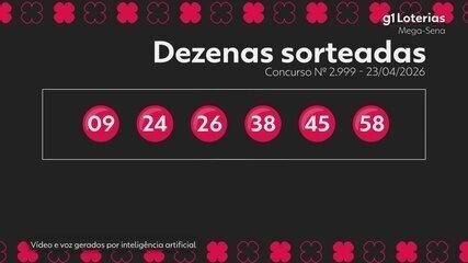 O sorteio do concurso 2.999 da Mega-Sena foi realizado na noite desta quinta-feira (23), em São Paulo. Nenhuma aposta acertou as seis dezenas, e o prêmio para o próximo sorteio acumulou em R$ 100 milhões. Veja os números sorteados: 09 – 24 – 26 – 38 – 45 – 58 5 acertos – 111 apostas ganhadoras: R$ 28.755,274 acertos – 5.741 apostas ganhadoras: R$ 916,43 O próximo sorteio da Mega será no sábado (25). Mega-Sena, concurso 2.999 — Foto: Reprodução / Caixa Como funciona a Mega-sena Para apostar na Mega-Sena Os jogos podem ser realizados até as 20h (horário de Brasília) em qualquer lotérica do país ou por meio do site e aplicativo Loterias Caixa, disponíveis em smartphones, computadores e outros dispositivos. Já os bolões digitais poderão ser comprados até as 20h30, exclusivamente pelo portal Loterias Online e pelo aplicativo. O pagamento da aposta online pode ser realizado via PIX, cartão de crédito ou pelo internet banking, para correntistas da Caixa. É preciso ter 18 anos ou mais para participar. Probabilidades A probabilidade de vencer em cada concurso varia de acordo com o número de dezenas jogadas e do tipo de aposta realizada. Para um jogo simples, com apenas seis dezenas, que custa R$ 6, a probabilidade de ganhar o prêmio milionário é de 1 em 50.063.860, segundo a Caixa. Já para uma aposta com 20 dezenas (limite máximo), com o preço de R$ 232.560,00, a probabilidade de acertar o prêmio é de 1 em 1.292, ainda de acordo com a instituição. Volante da Mega-Sena — Foto: Ana Marin/g1