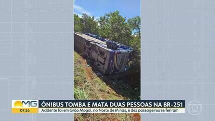 As duas pessoas que morreram no tombamento de um ônibus na BR-251, em Grão Mogol, no Norte de Minas, foram atingidas por um galho de árvore que perfurou a lataria do veículo. A informação foi repassada ao g1 pelo sargento do Corpo de Bombeiros, Frederico Santos de Jesus, que atuou no resgate das vítimas.