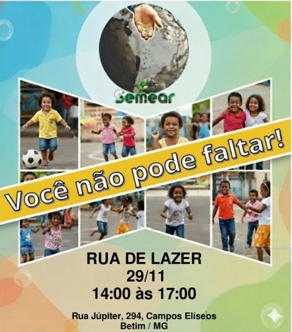 A Rua de Lazer faz parte do compromisso da Semear com o desenvolvimento educacional, cultural e social de Betim. A ONG, que já atua com projetos voltados à inclusão e à formação cidadã, pretende ampliar o alcance de suas iniciativas com o apoio da Lei de Incentivo à Cultura e de parceiros locais e empresariais.