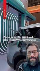 O equipamento fornece 1.500 kW de potência, número cinco vezes maior do que o dos carregadores rápidos mais avançados disponíveis hoje no Brasil, que operam em torno de 300 kW. Com isso, a BYD afirma ser possível recuperar 70% da bateria em cinco minutos e chegar a 97% em nove minutos. A solução exibida no evento consiste em uma estrutura em formato de “T”, com dois pontos de recarga. Assim, dois veículos podem ser carregados simultaneamente. Dois fatores são essenciais para que a recarga ultrarrápida funcione. O primeiro diz respeito ao local da instalação, que precisa contar com infraestrutura capaz de suportar um volume tão grande de energia concentrado em um único ponto. (O repórter viajou para o evento a convite da Leapmotor e GWM.) Para contornar essa limitação, a BYD utiliza um conjunto de baterias que é carregado gradualmente quando não há veículos conectados. Quando um carro é plugado, tanto a rede elétrica quanto esse banco de baterias passam a fornecer energia ao veículo na maior velocidade possível. Em entrevista ao g1, Alexandre Baldy, vice-presidente sênior da BYD no Brasil, afirmou que a estrutura atual de carregadores rápidos pode ser adaptada para operar com potências acima de 1.000 kW. Carregador ultrarrápido da BYD no Salão do Automóvel de Pequim — Foto: André Fogaça/g1 “Você incorpora um banco de baterias para que você armazene eletricidade continuamente, para que elas estejam sendo carregadas, para que você tenha um carro que, quando parar para ser carregado, tenha 400 km em 5 minutos”, explicou o executivo. Segundo Baldy, esses carregadores estarão disponíveis nas concessionárias da Denza, marca de luxo da BYD. Ele também afirmou que haverá novos pontos de recarga, organizados como hubs com vários equipamentos, somando 1.000 carregadores em todo o Brasil até o fim de 2027. O segundo ponto fundamental é que o veículo conectado ao carregador seja capaz de receber a tensão fornecida. Atualmente, alguns modelos da Denza já são compatíveis, e a BYD pretende ampliar essa capacidade para outros carros da marca. Para efeito de comparação, o carro elétrico mais barato da BYD, o Dolphin Mini, suporta recarga de até 40 kW. Mesmo que seja conectado a um eletroposto de 1.500 kW, ele receberá apenas a potência máxima que consegue suportar. Para suportar uma recarga tão rápida, o veículo precisa contar com diversos componentes específicos, incluindo sistemas de segurança reforçados para a bateria, motor e o próprio carregador.