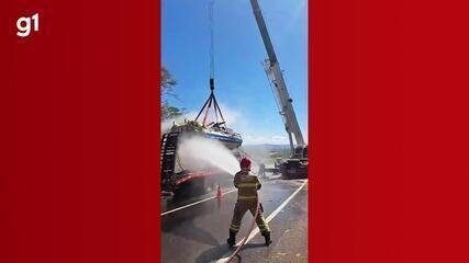 Segundo o Corpo de Bombeiros, um caminhão-guindaste foi utilizado na operação, e o trânsito na rodovia precisou ficar interditado por cerca de 1h30.