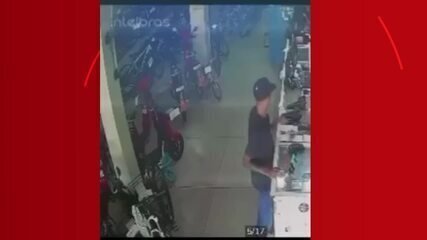 Pelas imagens, é possível ver que o homem anda pelo local, se aproxima do balcão de uma loja de bicicletas e chega a conversar com uma atendente. Ele aproveita o momento em que a mulher está de costas para colocar o cofre embaixo da blusa.
