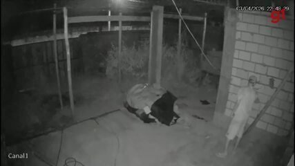 Imagens de uma câmera de segurança (veja o vídeo acima) mostram um homem invadindo uma obra em Pirapora. O proprietário acionou a Polícia Militar e disse que estava acompanhando a ação em tempo real.