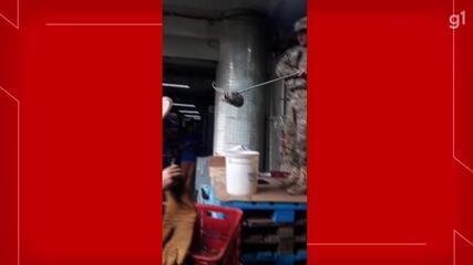 Os policiais militares foram chamados por volta das 9h20 e filmaram o resgate (veja vídeo acima). Nas imagens é possível ver um policial em cima de pedaços de madeira para alcançar o saruê que estava no forro do supermercado.